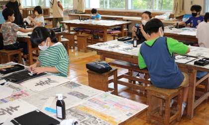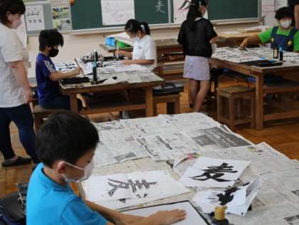 「麦」という字に取り組んでます。払いに気を付けて書いています。