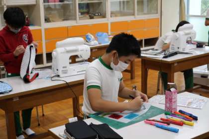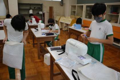 6年生の家庭科では、ミシンを使って袋を作っています。