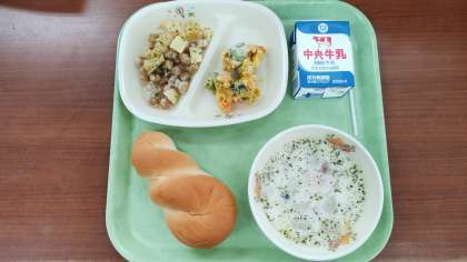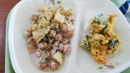 今日は子供たちから人気の高い青のりポテトビーンズと、栄養満点のかぼちゃを使ったかぼちゃのアーモンドサラダにしました。おいしく食べて元気になってほしいです。