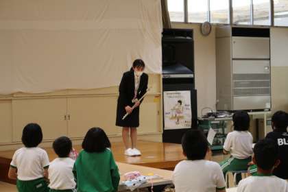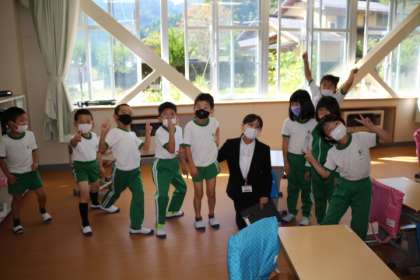 今日から4週間、教育実習生が勤務します。朝の会や帰りの会、給食等は1年生でともに生活をします。研究授業等も同学級で実施する予定です。全校でのあいさつではフルートの演奏を披露してくれました。
