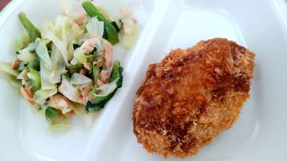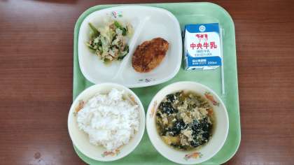 ごはん ひとくちカツ 小松菜のあえもの かきたま汁