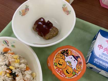 ハロウィンには魔除けとして、家の外にかぼちゃで作ったジャックオーランタンを飾ります。給食ではかぼちゃ型のハンバーグと、かぼちゃプリンで雰囲気を出してみました。楽しく食べてくれると嬉しいです。