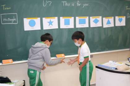子どもたちはとても夢中になり、黒板に示された図形を指して、大きな声で「triangle」「square」など発音していました。