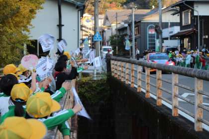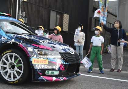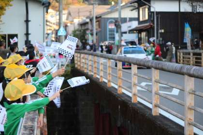 11月11日、世界ラリー選手権(WRC)のリエゾン区間が稲武の街中に設定されているので、沿道でラリーカーの見学をしました。子どもたちはラリーカーが通るたびに旗を振りながら、声援をあげていました。「すごい」「かっこいい」といった声も随所であがっていました。