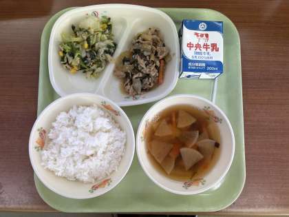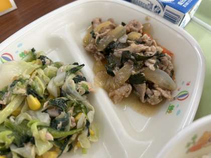 【今日の献立】 ごはん 豚肉の生姜焼き 小松菜のあえもの 八杯汁