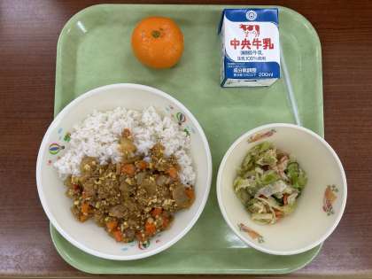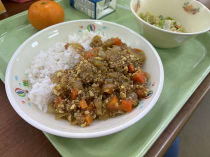 キーマカレーはひき肉を使用したカレーのことを言います。給食ではひきわり大豆も入れて栄養たっぷりにしました。