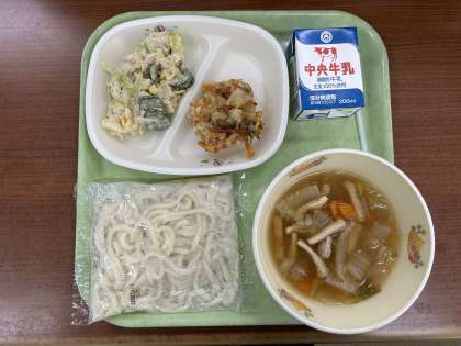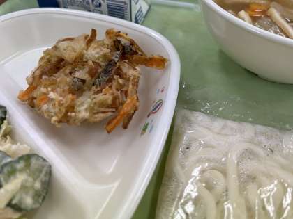 きつねうどんとは油揚げが入っているうどんのことを言います。由来はきつねが油揚げが好きだと言われているからです。今日はかき揚げも入れてうどんを楽しんでほしいと思います。