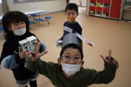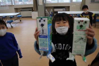 1年生の図工は、いろいろな箱を使って、様々な形を作っています。