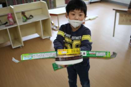 帽子や動物など、箱から発想を広げ様々なものを作りました。