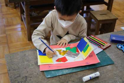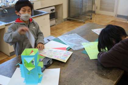 2年生の図工では、色紙や厚紙を使って、窓から見える作品を作っています。