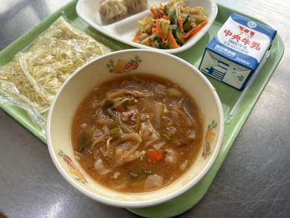給食のラーメンにはたっぷり野菜を入れています。たくさん食べてほしいと思います。