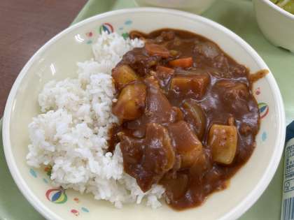 今日はハヤシライスにしました。たくさんの具材を煮込んで、ルゥで味付けし、脱脂粉乳を加え栄養満点かつ、濃厚な味に仕上げました。