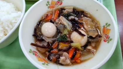 今日の八宝菜にははくさい、チンゲンサイ、にんじん、たまねぎ、もやし、豚肉、いか、うずら卵、きくらげが入っています。