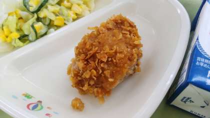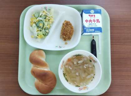 ツイストパン コーンフレークチキン コールスローサラダ オニオンスープ コーヒー牛乳の素