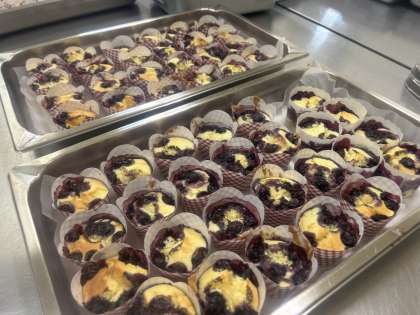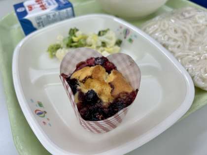 今日は稲武産のブルーベリーを使った手作りマフィンです。生地をシンプルにし、ブルーベリーをより感じられるようにしました。地域の恵みに感謝して食べましょう。