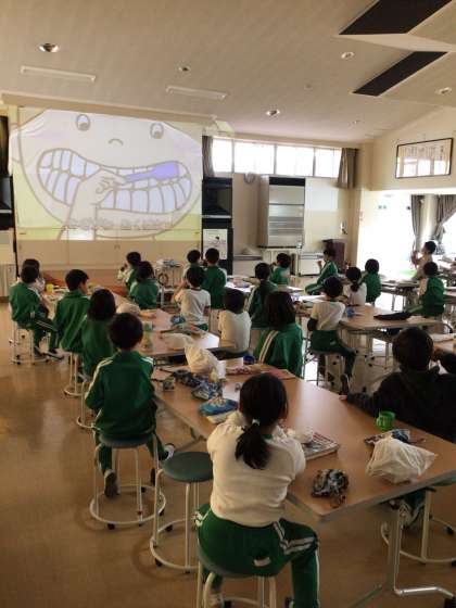 今年度から、歯みがき習慣の意識を高めるために、歯みがきの動画に合わせて全校で歯みがきを行っています。子どもたちは、動画に合わせて隅々まで歯をみがいています。