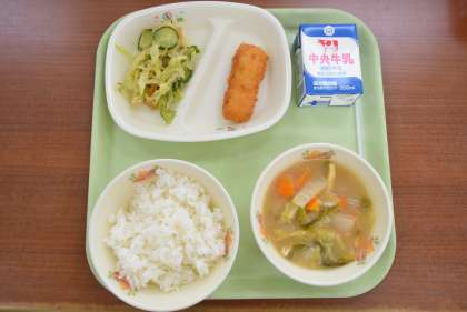 ごはん いかフライのレモンしょうゆかけ ぽりぽりサラダ みそちゃんこ汁