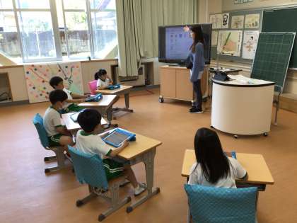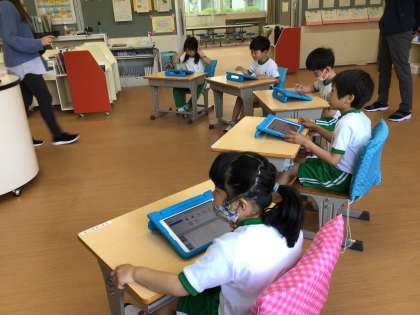 1年生は学習用タブレットの使い方について学んでいます。自分のパスワードを紙を見ないで入力できるように練習しました。