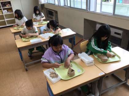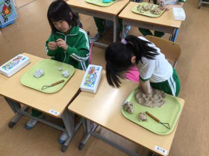 図工の授業で、生き物とそのすみかを粘土で作りました。切ったり、丸めたり、子ども達は思い思いに粘土を使って制作しました。