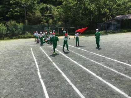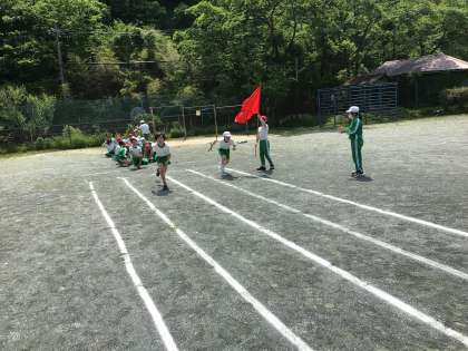 5、6年生の体育の授業で体力テストを行いました。50メートル走とソフトボール投げを計測しました。