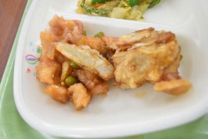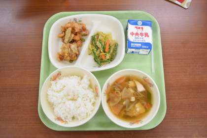 今日は稲武の学校給食では定番になっている大分県の郷土料理である「チキンチキンごぼう」です。油で揚げた鶏肉とごぼうを甘辛いたれであえています。こどもたちから人気のあるメニューです。