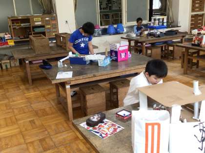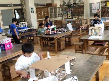 2階建ての迷路を制作しています。アイデアあふれるおもしろい迷路ができあがりそうです。