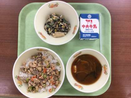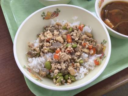 「歯と口の健康週間」4日目の今日のかみかみ献立は「かみかみそぼろ丼」と「切り干し大根のみそ汁」です。かみかみそぼろ丼にはれんこん、えだまめ、大豆が入っていてかみごたえがあります。よく噛んで食べましょう。