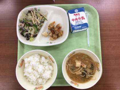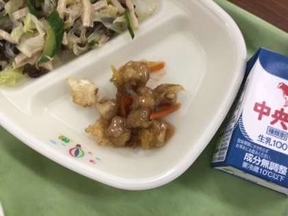 「歯と口の健康週間」4日目の今日のかみかみ献立は「きくらげ入り中華サラダ」と「まぐろの甘酢あんかけ」です。きくらげのコリコリとした食感と、噛むほど旨みがでるまぐろを楽しみながら噛んで食べて欲しいと思います。
