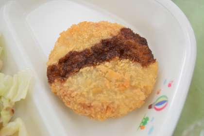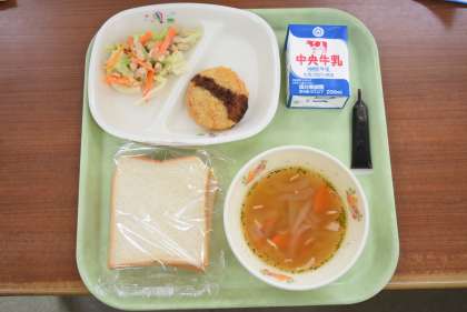 スライスパン まるっととよたひまわりポークメンチカツ ビーンズサラダ オニオンスープ コーヒー牛乳
