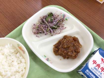 今日は揚げ豆腐に肉みそをかけてみました。あまじょっぱく味付けした肉みそは揚げ豆腐にもごはんにも合うと思います。新メニューなので子供達の反応が楽しみです。
