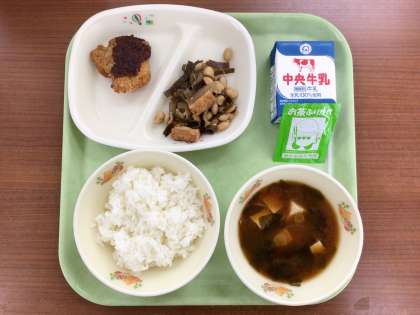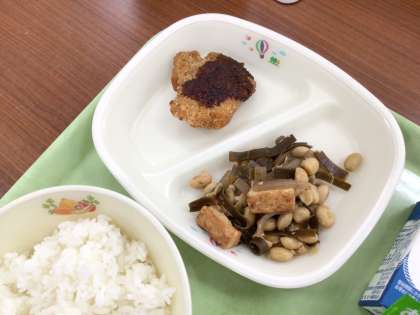 今日の五目煮豆には豊田市産の大豆を使用しています。厚揚げや昆布と一緒に煮付けて旨みのある煮物に仕上げました。