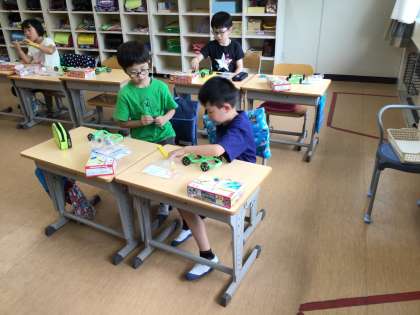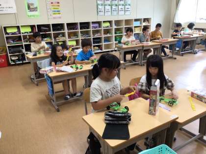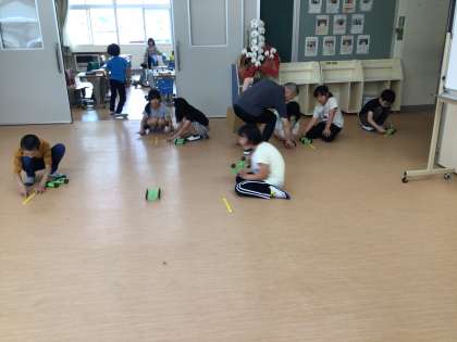 ゴムのはたらきについて学ぶために、ゴムで動く車を作成しました。作成後、ゴムの力で車が動くのか試してみました。