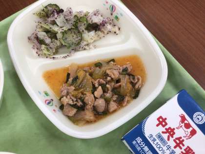 今日のぶたキムチ炒めにしました。豊田市産の白菜を加工したキムチを使用したぶたキムチ炒めです。ピリ辛な味付けなので、暑い今日には頑張る元気が出ます!