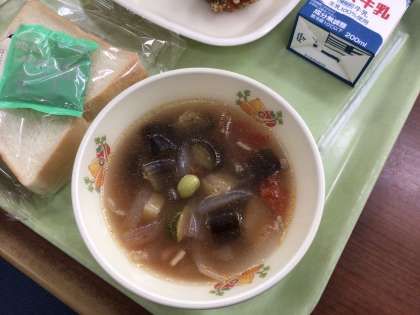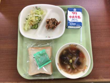 今日は昨年のヘルスランチ委員会の児童達が考えた「夏にぴったりな献立」です。夏野菜やフルーツを使って、夏らしさを出しました。味の感想を話し合えるといいなと思います。