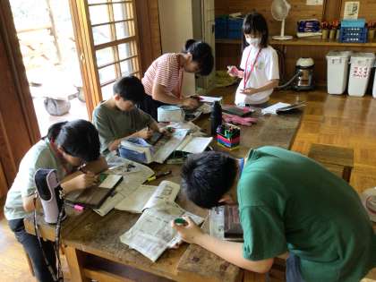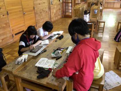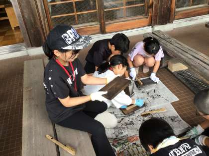 焼き杉を新聞紙で磨き、その杉に子ども達は考えてきたデザインをもとに絵や文字を描きました。