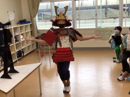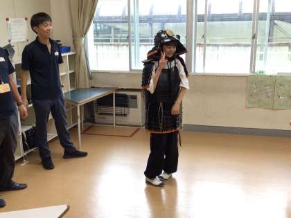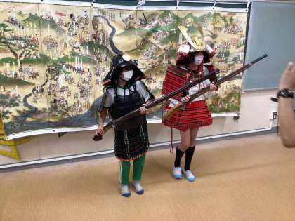 授業では、当時の鉄砲を持ってみたり、鎧を着てみたり、貴重な体験をすることができました。時代の違う2種類の鎧を観察して、その時代背景をみんなで考えることができました。