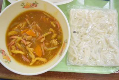 今日はカレーうどんにしました。カレールゥにだしを効かせて油揚げやかまぼこなどの食材を入れました。服に飛ばさないように気を付けて食べてほしいと思います。