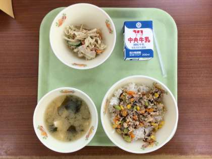 今日はツナと鶏そぼろを合わせた「ツナそぼろ丼」です。ツナとそぼろのほかにえだまめとにんじん、とうもろこしを入れ色鮮やかにしました。ごはんがすすむ味付けにできたと思います。