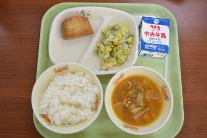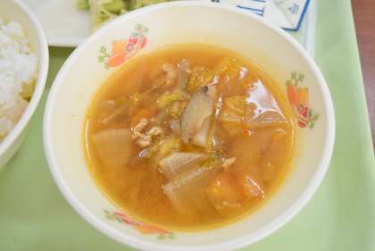 今日はこどもたちから人気のキムチ入りみそ汁にしました。キムチには愛知県産の白菜が使用されています。ピリ辛な味付けを楽しんでほしいと思います。