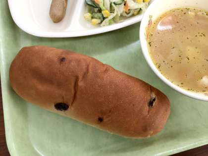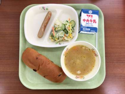レーズンロールパン ポークウインナー コーンサラダ トマトスープ