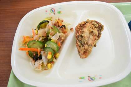 今日は小学1年生の国語の教科書に登場する「サラダで元気」というお話で作られる「りっちゃんの元気サラダ」です。いろいろな動物たちがさまざまな食材を教えてくれて、お母さんへのサラダを作ります。子供たちもサラダを食べて元気になってほしいと思います。