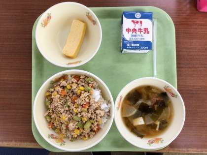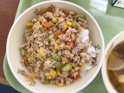 今日は色とりどりのそぼろ丼にしました。にんじん、えだまめ、とうもろこしを使い、茶色になりがちなそぼろ丼をカラフルにしています。とうもろこしは炒り卵に、えだまめはさやいんげんにしてもおいしく食べられそうです。いろいろな食材で楽しめる料理です。