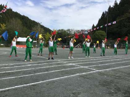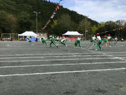 5、6年生のフラッグを使ったダンスの後、長さが様々な綱を自分の陣地に運ぶ綱取りの勝負をしました。仲間と協力して力いっぱい綱を引っ張りあいました。