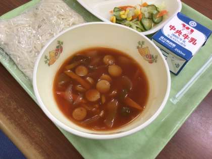 「あんかけスパ」は名古屋市のご当地グルメで、トマトベースの味付けに、こしょうとチリパウダーでピリ辛に仕上げます。食べた時の子供たちの反応が楽しみです。