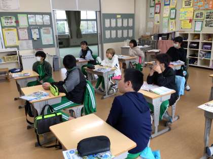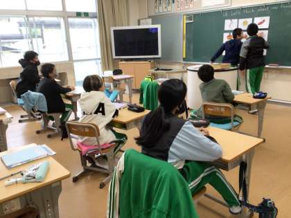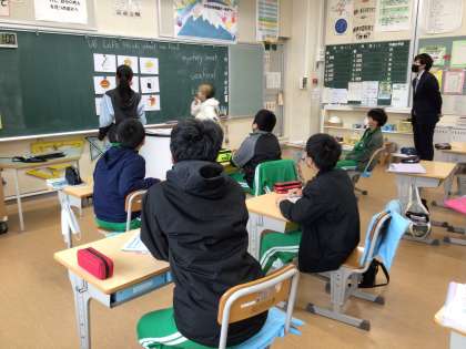 英語の質問の答えのカードを早く見つけるゲームをしました。楽しみながら英語に親しむことができました。