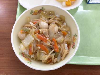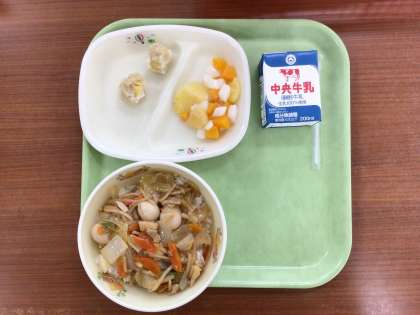 今日は具沢山な中華丼です。ぶた肉、うずら卵、いかなどのタンパク質と、さまざまな野菜とが入り、栄養満点です。いっぱい食べて元気を補給してほしいと思います。