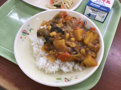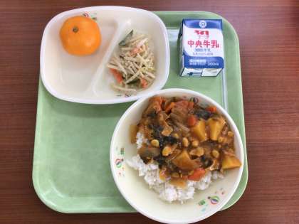 ほうれんそうと大豆のカレーライス ごぼうサラダ みかん