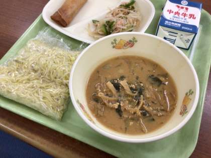 中華献立の定番メニューである坦々スープを、みそラーメンのレシピを参考にアレンジを加えました。子供達の反応が楽しみです。