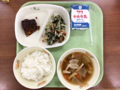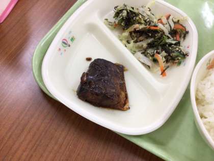 今日は「八丁味噌」が使われたさばのみそ煮です。八丁味噌は豊田市のお隣の市である岡崎市が発祥で、味が濃く、赤黒い色をしているのが特徴です。ごはんが進むおかずです。
