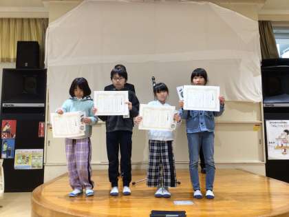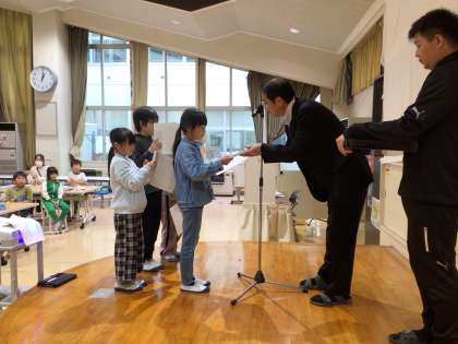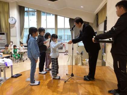 3年生の4名の子ども達にいなほ金賞を渡しました。マラソンの練習やテストなどを頑張ったことがいなほ金賞につながりました。